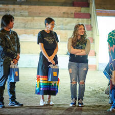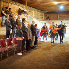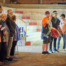 Chris Silver, Councillor from Semá:th First Nation and a grade 11 student from Yale Secondary, Fraser Smith, opened the honouring with a welcome song. The speaker of the ceremony, Perry Smith, who currently serves as the Director of Curriculum for the Abbotsford School District, shared with the audience that he and the artists would be blanketed and have their heads wrapped with a headband to symbolize having a good heart and good thoughts during the event. Witnesses were then called to remember the event, and some were called to speak about the work taking place. Artists were then walked around the longhouse and directed to stand on cedar bows placed upon the ground to represent a place "where no one had stood before them".