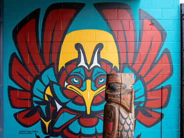 In the fall of 2021, Carlos Julian, an Indigenous Support Worker at John Maclure Community School, emailed a local Indigenous artist in hopes that they would be able to paint a mural at the school in honour of their mascot, a Thunderbird. The artist's work captured Carlos' interest online for her colourful, bold and beautiful First Nations-style art.